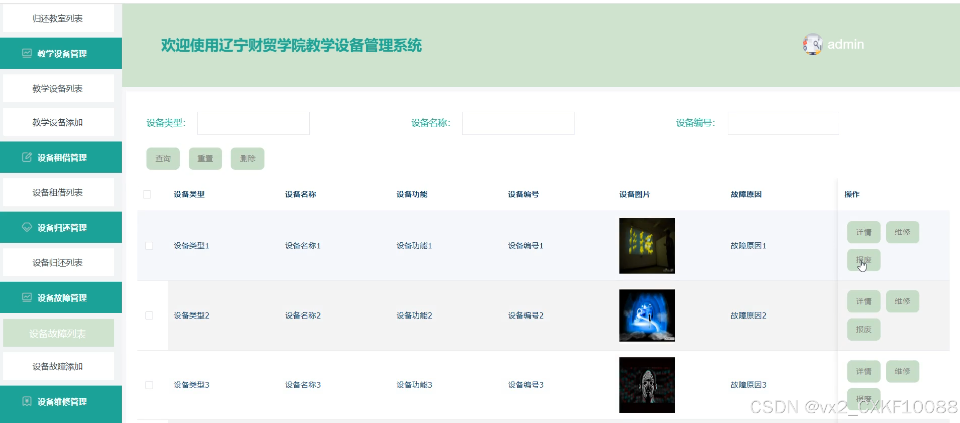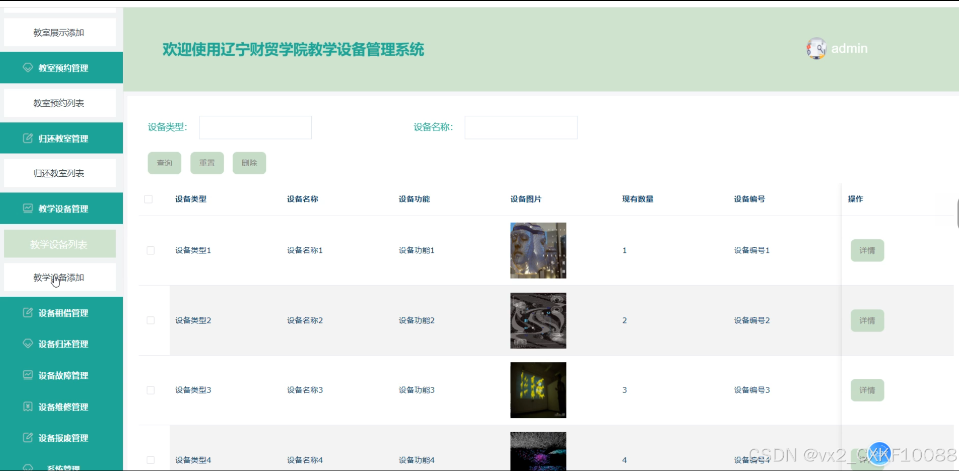 通过教学设备管理页面,管理员可以对教学设备的设备类型、设备功能、现有数量、设备名称、设备图片、设备编号进行增删改查,将展示在系统前台及小程序端方便用户查看租借,并且可以根据设备需求进行调整,如图5-9所示。