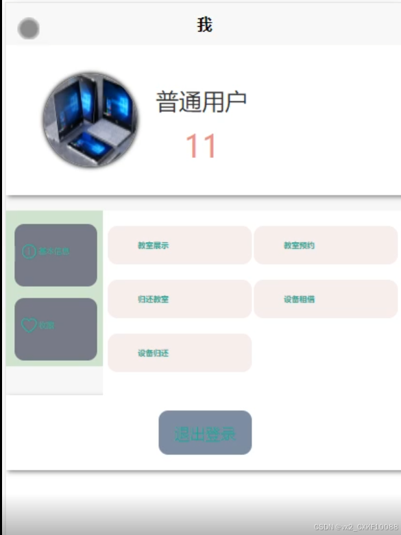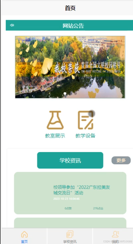 在首页,用户可以轻松访问、查看首页、学校资讯、教室展示、教学设备、我的(基本信息、收藏、教室展示、教室预约、归还教室、设备租借、设备归还)等多种功能,如图5-3所示,为用户提供了更加便捷的服务。