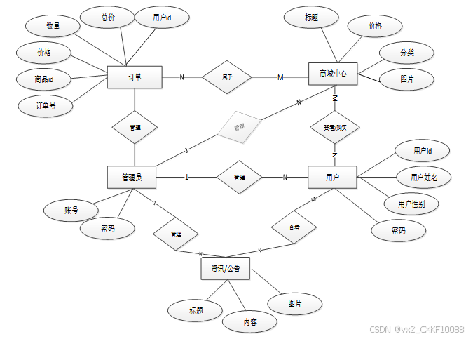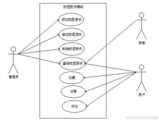 (2)校园资讯模块:管理员在后台可以对校园资讯及其分类进行增删改查,游客实现查看校园资讯,用户进行收藏、点赞、评论。删改查,游客实现对校园资讯的查询,用户则实现校园资讯的收藏、评论、加购等操作。如下图2-2所示。