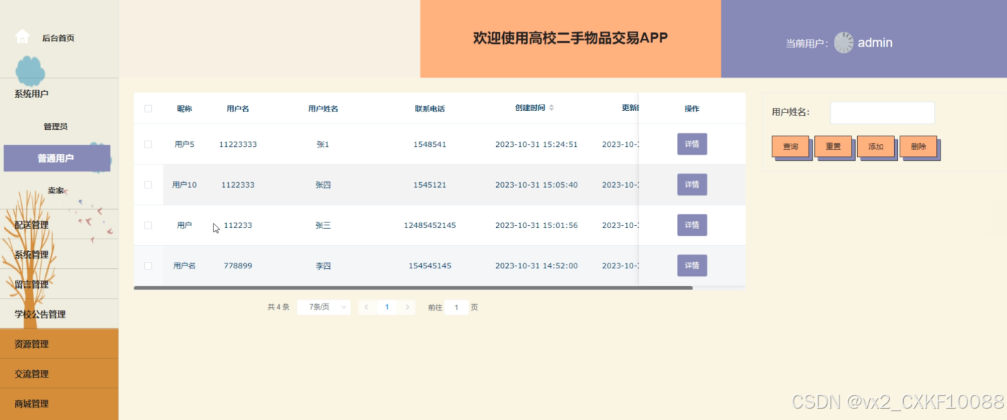 高校二手物品交易APP中的管理人员是可以对前台注册的普通用户进行管理。普通用户界面如下图5-11所示。