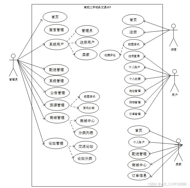 本高校二手物品交易APP分为前台用户以及后台管理员两个页面,前端由游客/用户进入,用户登录后实现商品的购买,后端是卖家登录后对订单的配送等,管理员进行登录,登录以后对高校二手物品交易APP所有数据进行管理。高校二手物品交易APP的总体用例图如图3-5所示