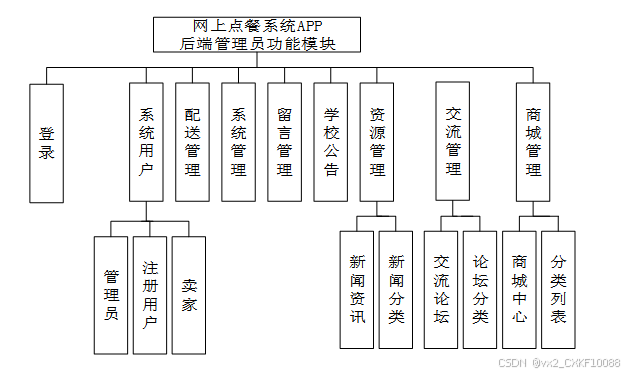 本高校二手物品交易APP总体的体系结构图分为前端用户体系结构和后端管理员体系结构,其具体结构图如图3-1和图3-2所示