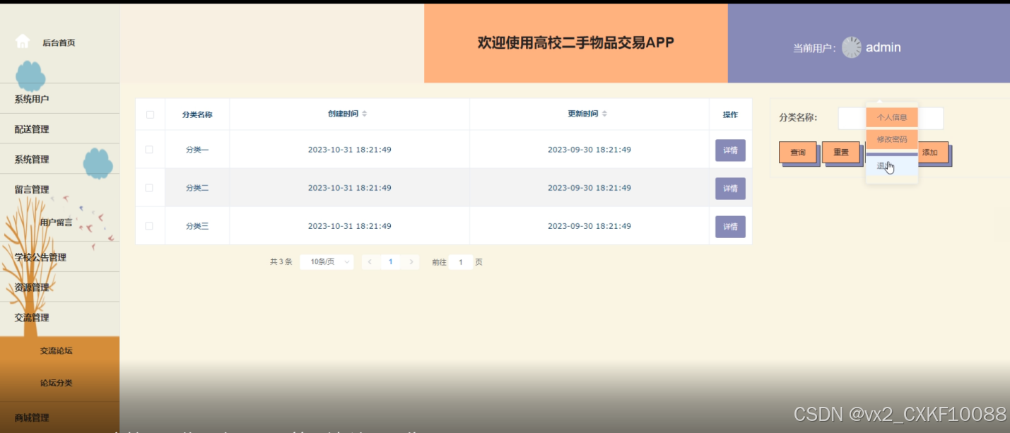 (8)论坛管理:管理员可以对交流论坛、论坛分类进行增删改查。