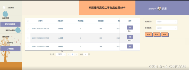 高校二手物品交易APP中的卖家是可以对高校二手物品交易APP内的商城中心订单进行管控的,同时支持根据订单编号或者是商品的名称来具体检索商城中心订单记录信息。订单列表界面如下图5-15所示。