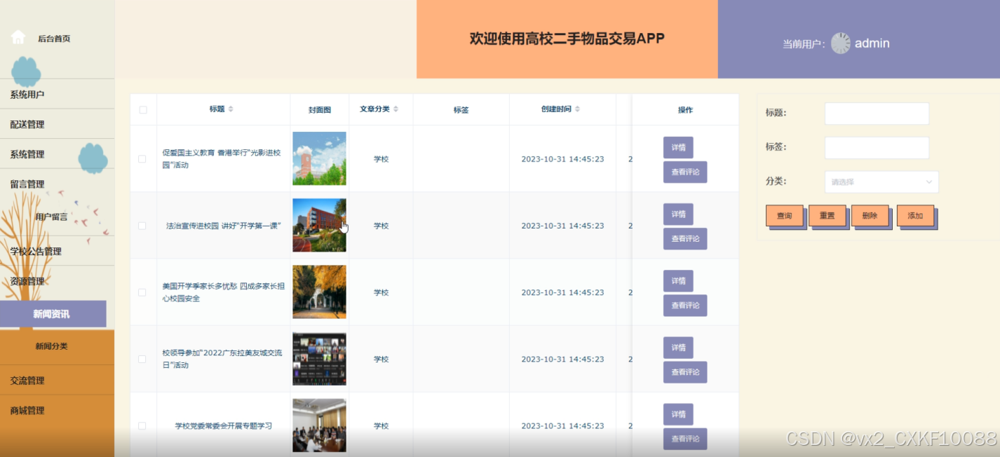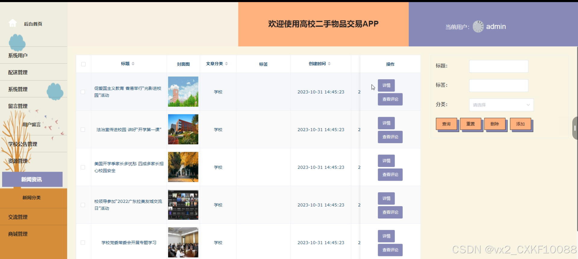 高校二手物品交易APP中的管理人员是可以对校园资讯以及资讯分类的分类进行增删改查操作。校园资讯界面如下图5-12所示。