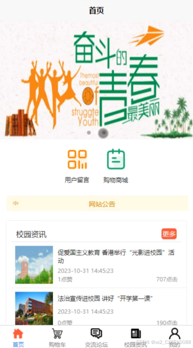 (1)首页信息:当用户登录或者注册成功之后,进入系统的前台,就可以看到首页、用户留言、购物商城、购物车、交流论坛、校园资讯、我的等信息,用户可以根据自己个人的需求进行查看;