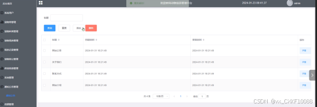 (10)通知公告管理:管理员可以对通知公告进行查询、添加、重置和删除操作。