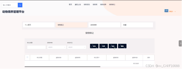 (7)宠物转让管理:管理员可以对宠物转让信息进行查询、添加、重置和删除操作,可以查看宠物转让列表中某一转让详情并进行审核和回复。