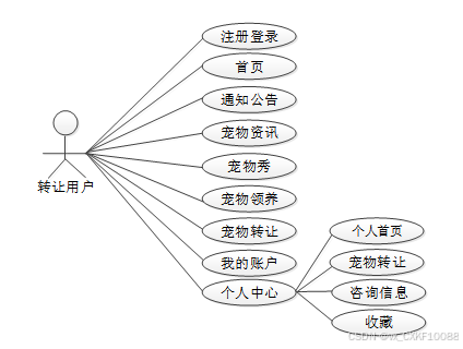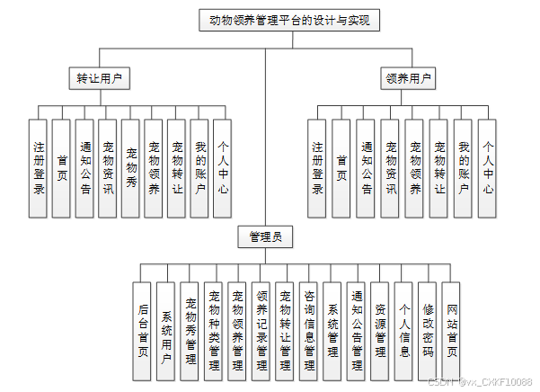 按照动物领养管理平台的角色,主要包括转让用户、领养用户和管理员这三大功能模块,各模块功能内容如下: