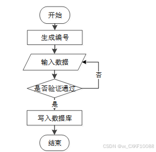 用户成功登入系统后就能够实现增加数据的操作,增加数据的编号由系统生成,用户不能随意填写,除了编号以外,其他增加信息用户自己填写,填写后的信息经过系统验证,验证通过后即可完成数据新增,数据新增的流程图如下图2-1所示。