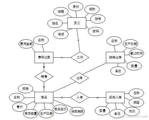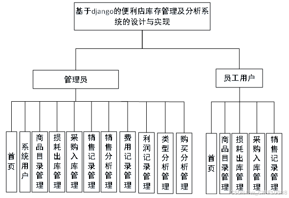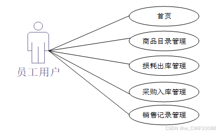 员工用户包括:后台首页、商品目录管理、损耗出库管理、采购入库管理、销售记录管理等功能。员工用户用例如图3-6所示。