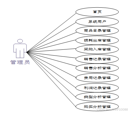 系统中的核心用户是管理员,管理员登录后,通过管理员功能来管理后台系统。主要功能有:首页、系统用户、商品目录管理、商品目录管理、损耗出库管理、采购入库管理、销售记录管理、销售分析管理、费用记录管理、利润记录管理、类型分析管理、购买分析管理等功能。管理员用例如图3-5所示。