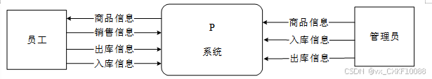 1.数据流图0层0层数据流图是由普通用户、管理员及便利店库存管理及分析系统组成的,用户可以向系统提入库信息、出库信息、销售记录信息;管理员可以向系统提供入库信息、统计信息、商品信息;管理员把商品信息传给系统,系统会把商品信息提供给用户。