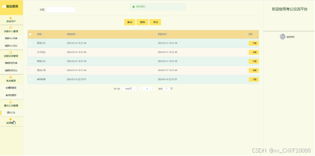 (3)通知公告:当用户点击“通知公告”这一菜单按钮,会显示管理员在后台发布的所有的通知公告,可以查看详情。