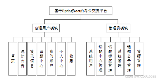 考公交流平台我划分为了普通用户模块和管理员模块这两大部分。