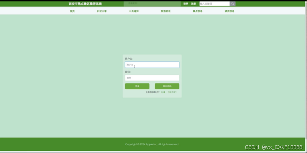 基于django的西安市热点景区推荐系统中的注册后的用户是可以通过自己的账户名和密码进行登录的,当用户输入完整的自己的账户名和密码信息并点击“登录”按钮后,将会首先验证输入的有没有空数据,再次验证输入的账户名+密码和数据库中当前保存的用户信息是否一致,只有在一致后将会登录成功并自动跳转到基于django的西安市热点景区推荐系统的首页中;否则将会提示相应错误信息,用户登录界面如下图4-2所示。