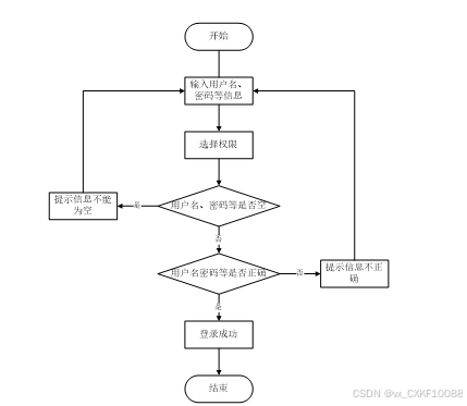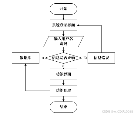 用户打开并进入系统后,会先显示登录界面,输入正确的用户名和密码,系统自动检测信息,若信息无误,则用户会进入系统功能界面,进行操作,否则会提示错误无法登录,操作流程如图2-3所示。