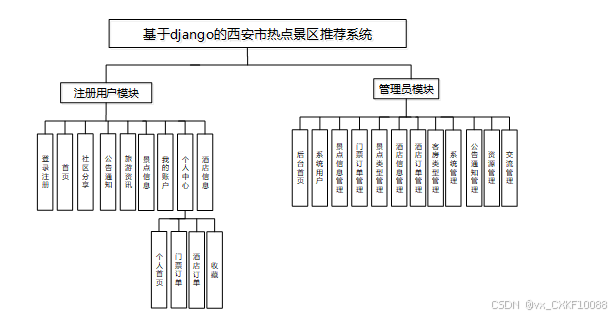 按照基于django的西安市热点景区推荐系统的角色,系统划分为了注册用户模块和管理员模块这两大部分。