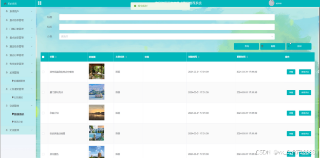 当管理员点击“资源管理”这一菜单的时候,会出现旅游资讯+资讯分类这两个子菜单,可以对这两个模块进行增删改查操作。资源管理界面如下图所示。
