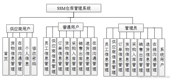 仓库管理系统可以划分为注册普通用户和管理员模块及供应商用户模块三大部分。