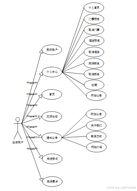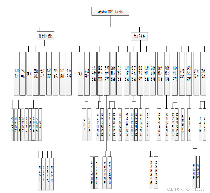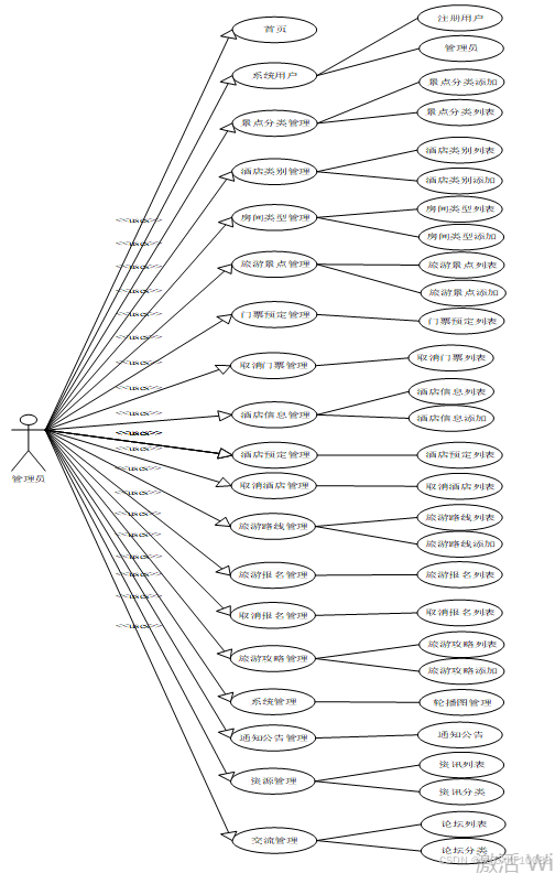 系统设计的目的是分析系统包括的所有功能结构,为开发人员设计开发和实现系统做好准备工作。经过前期的需求调查、分析和整理之后,确定的总体需求主要包括多个模块,分别是:首页、系统用户(管理员、注册用户)、景点分类管理(景点分类列表、景点分类添加)、酒店类别管理(酒店类别列表、酒店类别添加)、房间类型管理(房间类型列表、房间类型添加)、旅游景点管理(旅游景点列表、旅游景点添加)、门票预定管理(门票预定列表)、取消门票管理(取消门票列表)、酒店信息管理(酒店信息列表、酒店信息添加)、酒店预定管理(酒店预定列表)、取消酒店管理(取消酒店列表)、旅游路线管理(旅游路线列表、旅游路线添加)、旅游报名管理(旅游报名列表)、取消报名管理(取消报名列表)、旅游攻略管理(旅游攻略列表、旅游攻略添加)、系统管理(轮播图管理)、通知公告管理(通知公告)、资源管理(资讯列表、资讯分类)、交流管理(论坛列表、论坛分类)。系统整体角色分为两个部分,一是注册用户、二是管理员。权限分布也是很明显,管理员可以实现对用户的增加以及删除,是最高权限拥有者。
