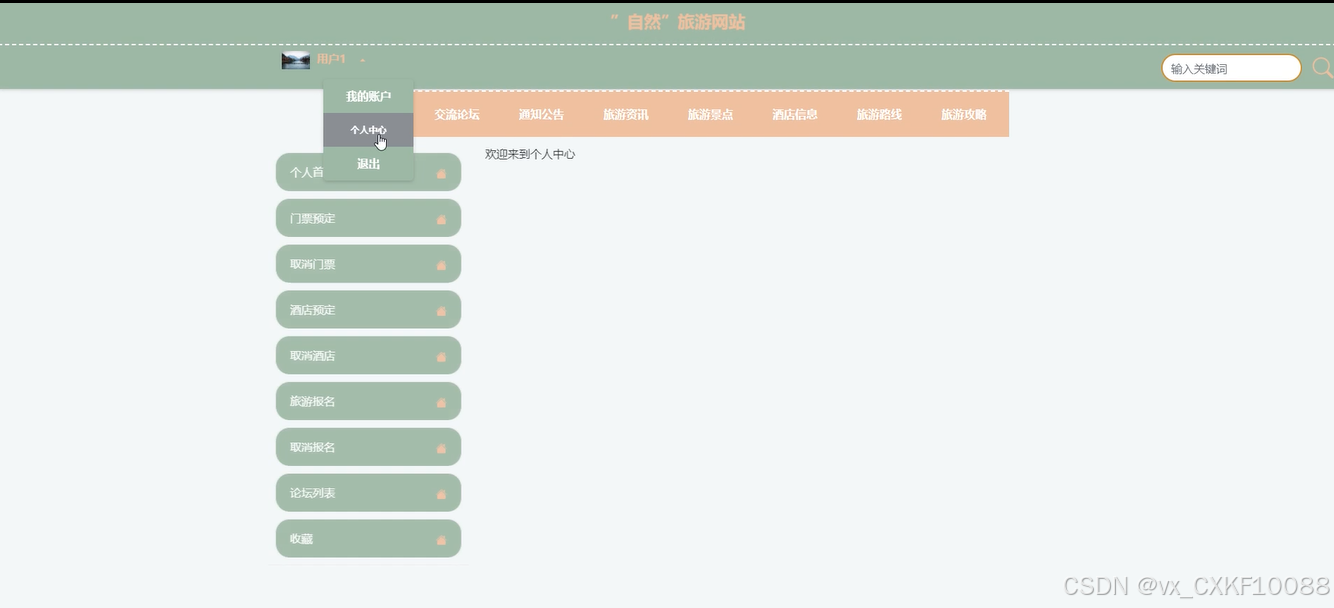 (5)我的账户:当用户点击首页左上角“用户”这个按钮,下面会出现“我的账户”、“个人中心”和“退出”这三个子菜单,点击“我的账户”可以对个人的资料、登录密码的信息进行修改,点击“个人中心”可查看个人首页、门票预定、取消消门票、酒店预定、取消酒店、旅游报名、取消报名、论坛列表、收藏等信息,点击“退出”按钮即可退出系统登录册登录界面:注册用户是可以通过自己的账户名和密码进行登录的,当用户输入完整的自己的账户名和密码信息并点击“登录”按钮后,将会首先验证输入的有没有空数据,再次验证输入的账户名+密码和数据库中当前保存的用户信息是否一致,只有在一致后将会登录成功并自动跳转到“自然”旅游网站的首页中;否则将会提示相应错误信息。