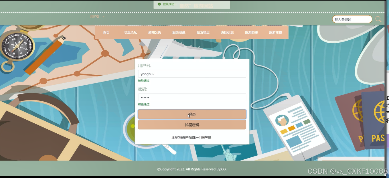 (3)用户登录:系统中的前台上注册后的用户是可以通过自己的账户名和密码进行登录的,当用户输入完整的自己的账户名和密码信息并点击“登录”按钮后,将会首先验证输入的有没有空数据,再次验证输入的账户名+密码和数据库中当前保存的用户信息是否一致,只有在一致后将会登录成功并自动跳转到“自然”旅游网站的首页中;否则将会提示相应错误信息。