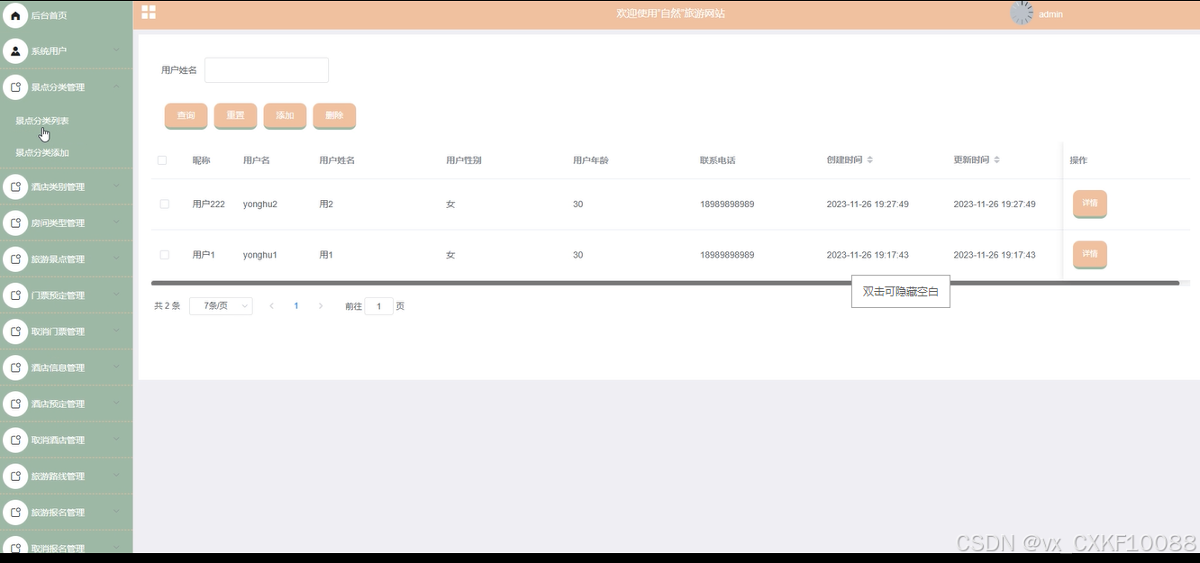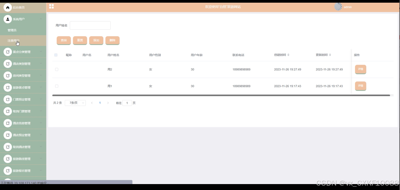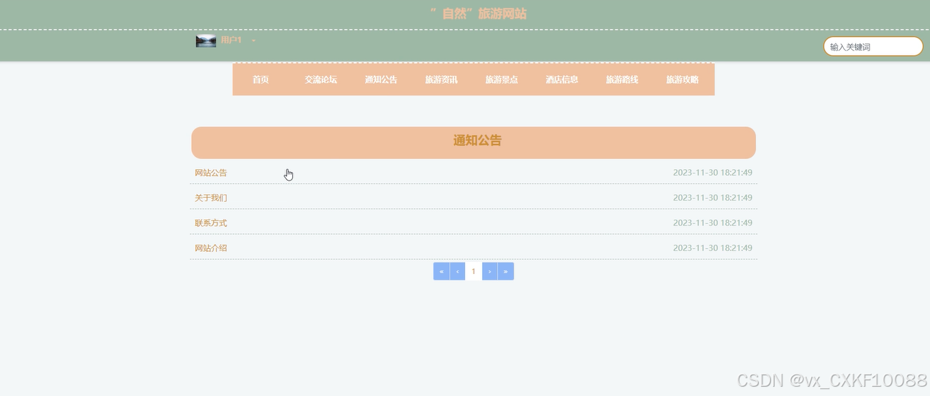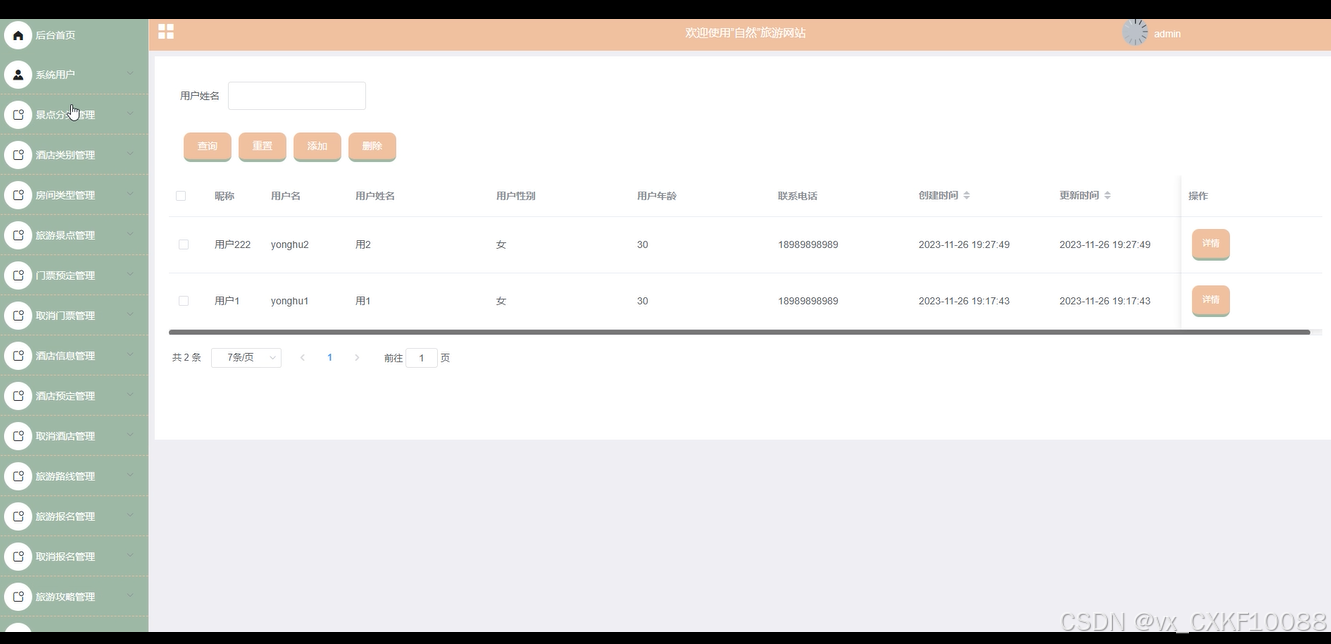 The "Nature" tourism website provides tourists with rich natural tourism resource information, including scenic spot classification management, hotel category management, room type management, tourist attraction management, ticket reservation management, cancellation ticket management, hotel information management, hotel reservation management, cancellation hotel management, tourism route management, tourism registration management, cancellation registration management, tourism strategy management, system management, notification and announcement management Information on resource management, communication management, etc. These pieces of information help tourists better plan their journeys and choose tourism destinations and activities that suit their interests and abilities.