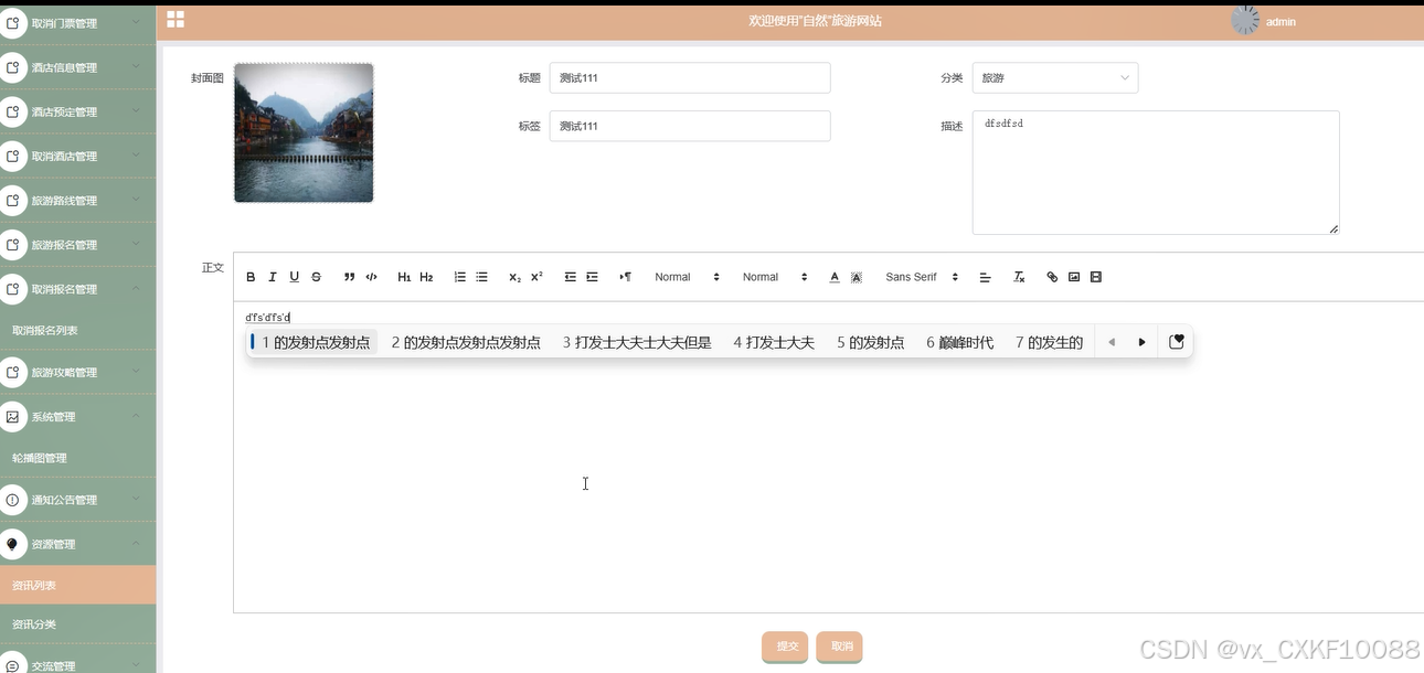 (6)资源管理:当点击“资源管理”这一菜单的时候,会出现资讯列表、资讯分类这两个子菜单,可以对这两个模块进行增删改查操作。