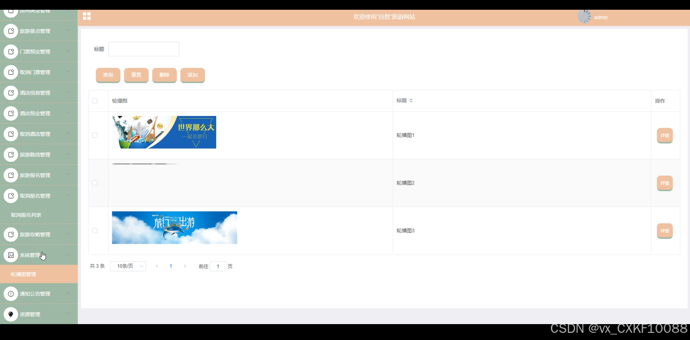 管理员可以对系统前台展示的轮播图以及公告栏进行增删改查,方便用户进行查看。轮播图管理界面如下图所示。