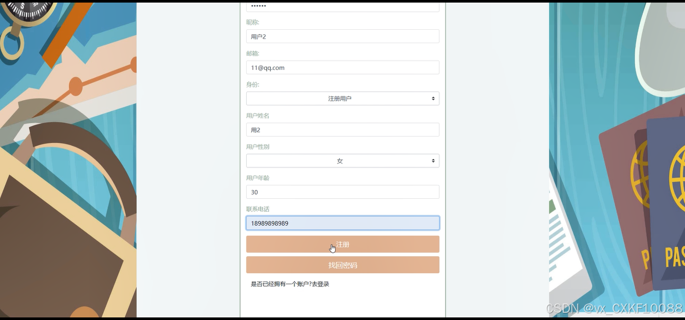 (2)用户注册:当会员用户想要进入本“自然”旅游网站中对资讯进行查看景点信息的时候,就必须要登录到系统当中,要是新的用户没有“自然”旅游网站的账号的话,点击“注册”按钮,就会进入到新用户注册这个界面上,用户输入对应的账号(必须填写)+密码(必须填写)+确认密码(必须填写,而且要与密码一直)+昵称+邮箱+性别+年龄+联系电话+选择用户身份等等,然后点击“注册”,系统在用户这一数据库中会查询账号是不是存在,两次密码是不是一样,都填写正确就会注册成功,然后再进行登录,如果是之前已经注册过的用户很长时间没有使用,忘记密码,也可以点击“忘记密码”进行找回。
