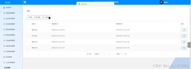 公告消息管理界面是管理员用来管理系统中的公告消息的界面。管理员可以通过该界面进行公告消息的创建、编辑、发布和删除等操作,以便向用户传达各种重要信息、公告、更新或事件等内容。其界面如下图5-12所示。