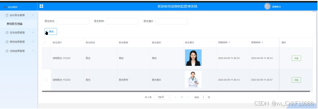 - 住院信息管理:用户用户用户可以查看住院信息列表中某个住院信息详情,可以通过医生姓名、医生职称、用户姓名等查询住院信息。