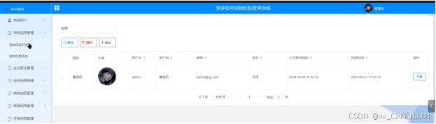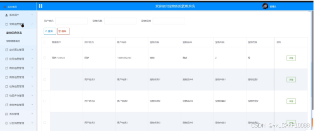 - 宠物信息管理:管理员可以添加宠物信息,可以查看宠物信息列表中某只宠物的详情,可以对列表信息进行查询和删除操作。