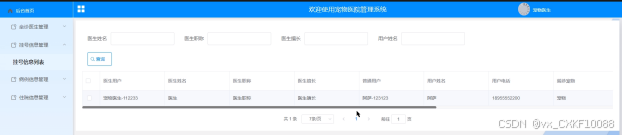 - 坐诊医生管理:用户可以查看坐诊医生列表中某个医生的信息详情,可以通过输入医生姓名、医生职称、医生擅长信息查询坐诊医生信息。