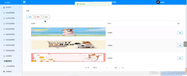- 系统管理:管理员在“系统管理”这一菜单下对轮播图进行管控,可以对轮播图信息进行查询、添加和删除操作。