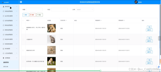 - 资源管理:管理员可以查看宠物资讯列表中某个资讯的详情和评论,可以对宠物资讯、资讯分类信息进行查询、添加和删除操作。