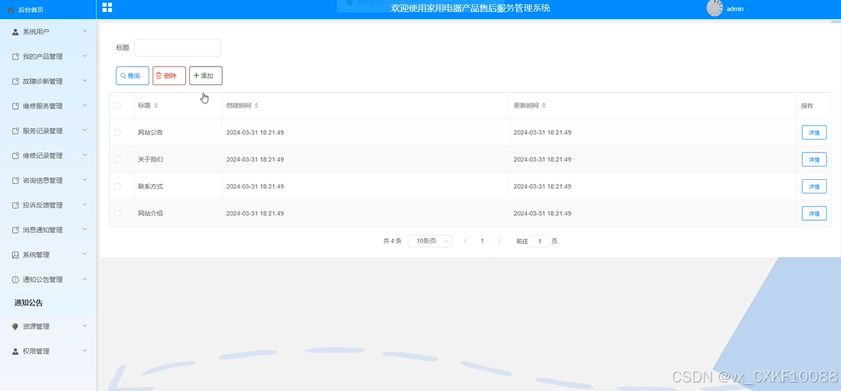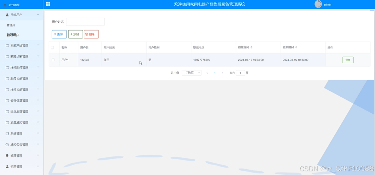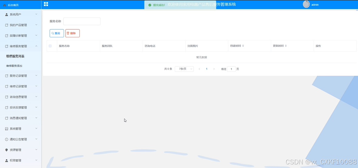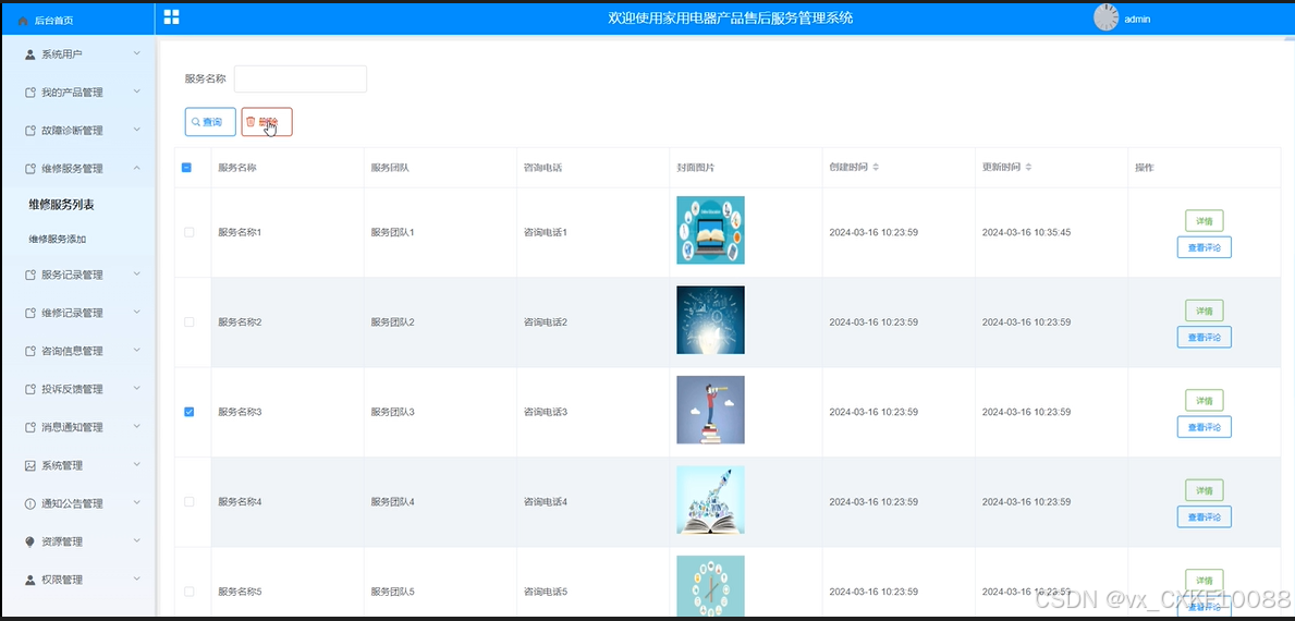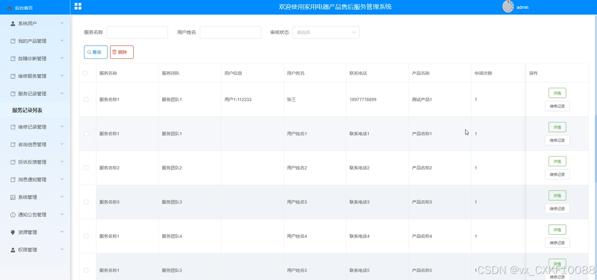管理员可以跟踪和管理家用电器产品的服务记录,包括服务类型、服务人员信息、服务时间等。界面如下所示。