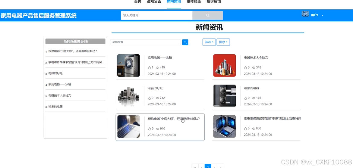 在本次家用电器产品售后服务管理系统中,利用了目前市场上普遍使用的Java技术,以及数据库管理功能MySQL,和目前比较流行的SpringBoot框架,最后配合使用到了VUE页面布局技术进行系统界面的布置,以现实生活的家用电器产品售后服务管理过程为标准,设计实现了维修服务、新闻咨询、故障诊断、点赞收藏、在线评论等功能,并维护好后台的信息和整体系统的稳定性。