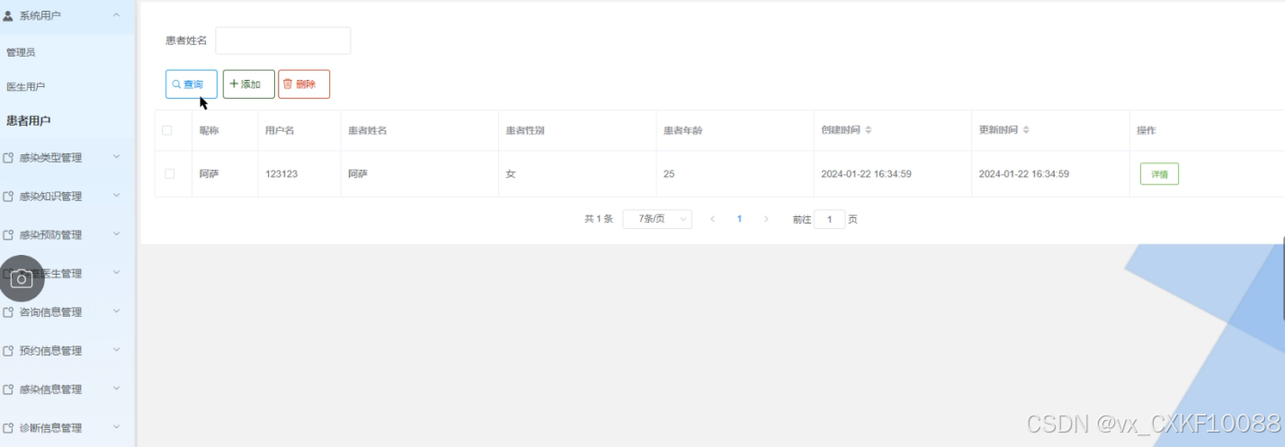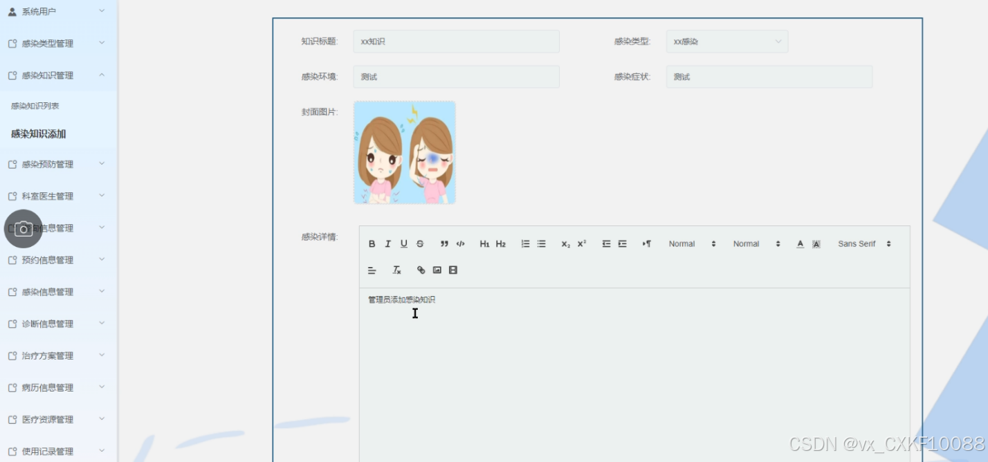 管理员点击“感染知识管理”会显示出所有的感染知识信息、也可以进行添加新的感染知识。界面如下图4-14所示。