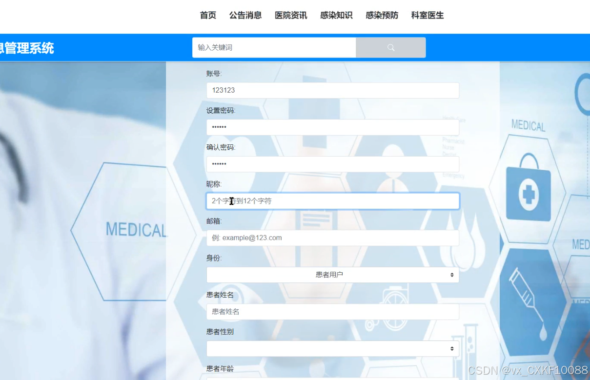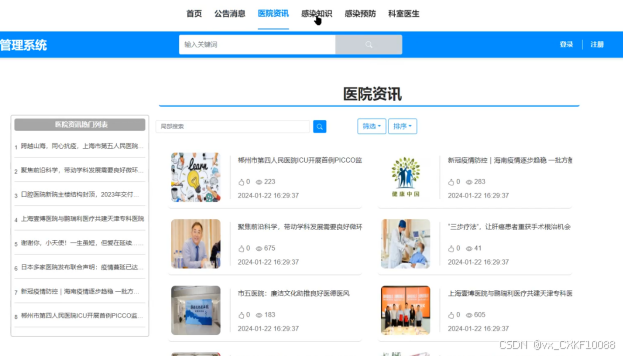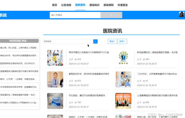 (2)首页信息浏览: 患者可以查看系统首页信息,包括公告、医院资讯、感染知识、感染预防、科室医生等内容,以便获取医疗健康相关信息。