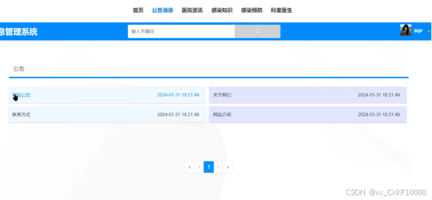 公告消息界面是医院传染病信息管理系统中重要的信息发布和传达平台,设计简洁明了。公告消息界面包括最新公告列表、公告详情展示、发布时间等内容。界面如下图4-4所示。