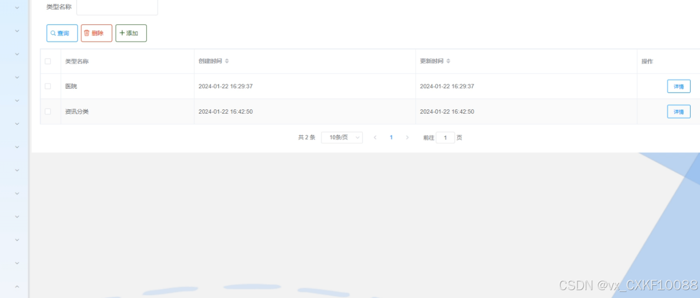 管理员点击“资源管理”菜单能够对其下子菜单医院资讯院资讯的分类进行增删改查。界面如下图4-15所示。