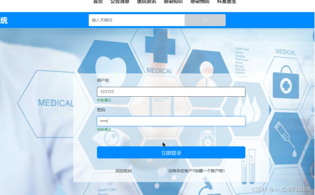 用户登录界面是医院传染病信息管理系统中用户访问系统的重要入口,设计要简洁明了。用户登录界面包括用户名和密码输入框,登录按钮以及忘记密码和注册入口。用户输入正确的用户名和密码后,点击登录按钮即可进入系统。错误提示功能可提醒用户输入有误,成功登录后有友好的提示信息,用户登录界面如下图4-3所示。