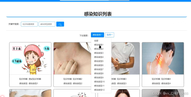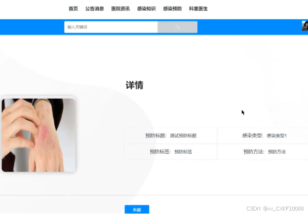 (5)感染知识查询: 提供感染知识相关信息,包括病毒类型、传播途径、预防措施等,用户可根据需求查看详细内容,并进行收藏、点赞和评论,以增强健康知识学习。