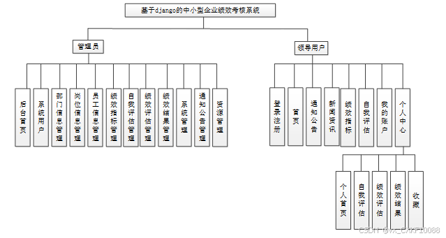 本基于django的中小型企业绩效考核系统是一个集信息查询、添加、管理为一体的平台,在功能上实现了管理员员工用户两部分的功能,根据第三章的系统功能分析,得出本基于django的中小型企业绩效考核系统的功能模块图,如图3-2所示。