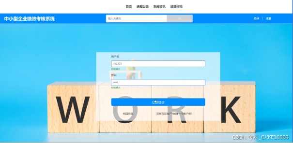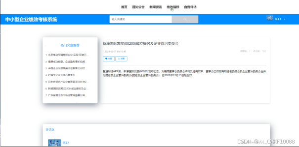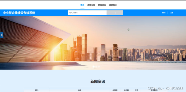 当进入中小型企业绩效考核系统的时候,首先映入眼帘的是系统的导航栏、通知公告以及轮播图等,右上角是用户登录以及注册按钮,其主界面展示如下图5-5所示。