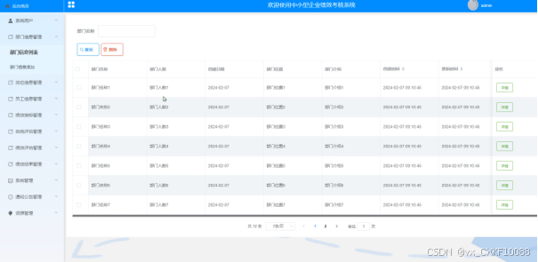 管理员点击“部门信息管理”这一菜单会显示部门信息列表、部门信息添加这两个子菜单,支持输入关键词进行查询,点击“详情”按钮可以查看和管理部门信息详情。如果想要添加新的部门信息,点击“部门信息添加”菜单,输入相关信息,点击“提交”按钮就可以添加了,同时可以选择某一条部门信息,点击“删除”进行删除。界面如下图所示。