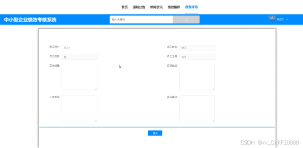 点击“自我评估”这一菜单按钮,员工可以填写自我评估表,根据绩效指标对自己进行评估并提交给上级审核。界面如下图所示。