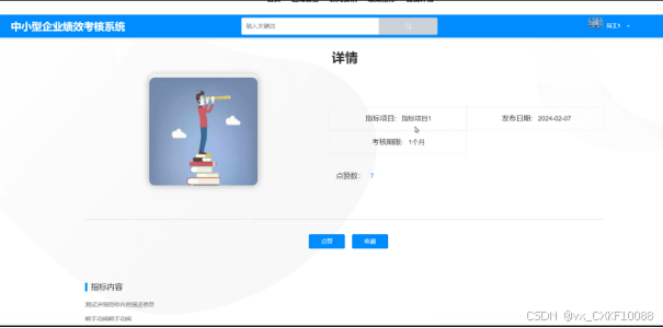 当员工用户点击中小型企业绩效考核系统中导航栏上的“绩效指标”后将会进入到该“绩效指标”列表的界面,点击某一绩效指标可查看该绩效指标项目详情,可以进行点赞、收藏、评论等操作,界面如下图所示。